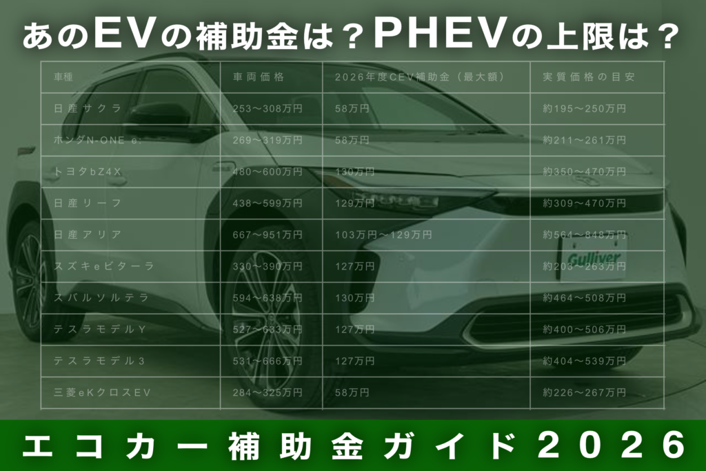 2026.04.23【エコカー補助金ガイド2026年4月版】EV・PHEV向け補助金を徹底解説!電動車購入の実質価格は?