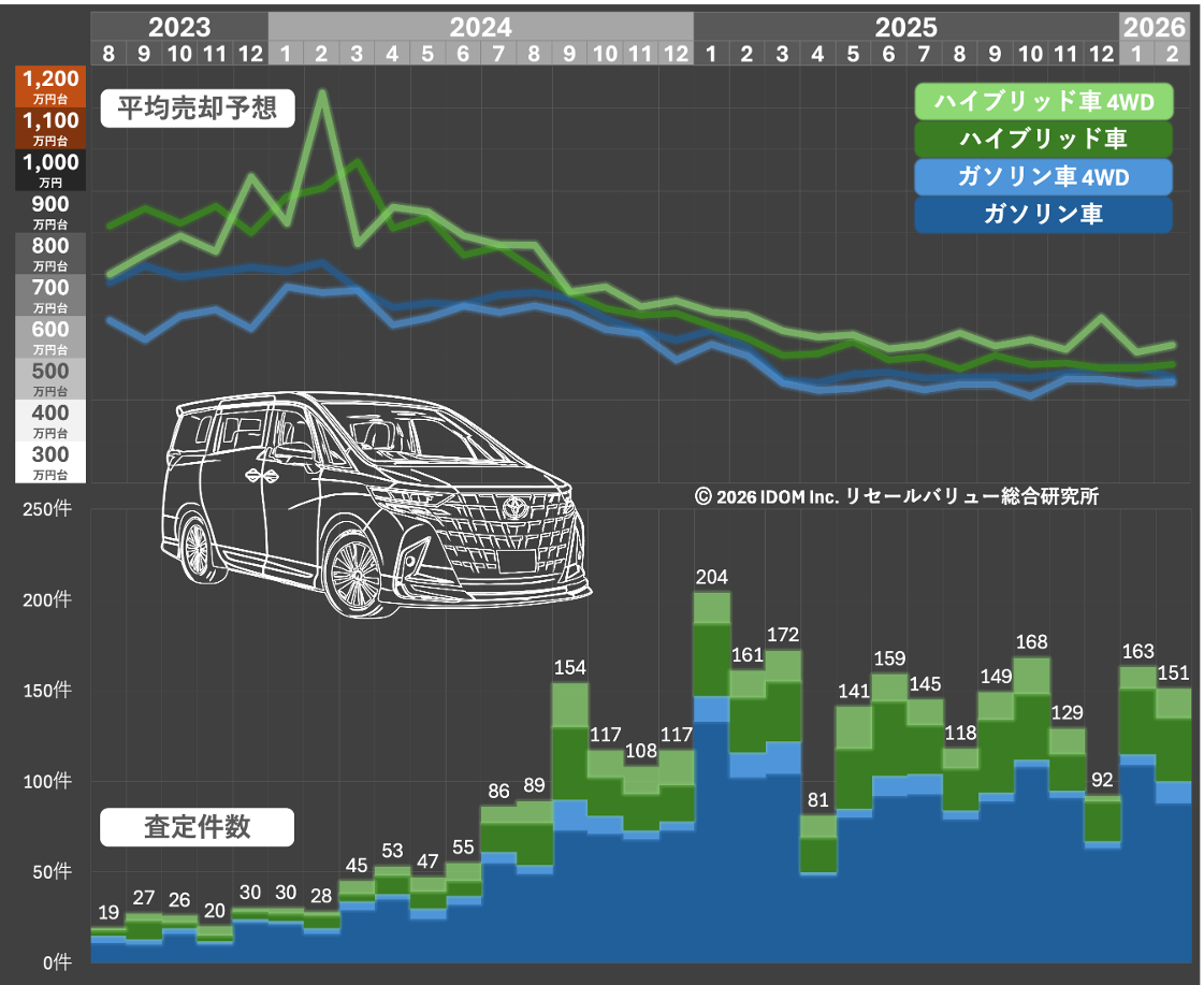 現行型(40系)アルファードの平均売却予想額の値動きを見てみると、2024年1−3月期をピークに価格は徐々に下降傾向に。特にハイブリッドモデルは2025年6月まで滑り落ちるように価格が下がっているのが見て取れます。対する査定件数の推移は、価格の下降傾向と反比例する形で増加傾向に。売却査定件数の増加=売却意向のユーザーの増加が平均売却予想額を押し下げていることを示唆しています。