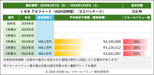下記はアルファードで査定件数最多のガソリン車(AGH30W型)でグレード「S Cパッケージ」のデータですが、3年落ちの30系最終モデルとなる2023年式の場合、平均売却予想額は約420万円程度でリセールバリューは90%となっています。