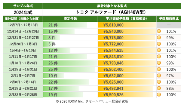 買取査定に持ち込まれ査定検査したクルマがオートオークション等で落札または売却される際の金額を予測し、全査定件数で平均化した金額です。