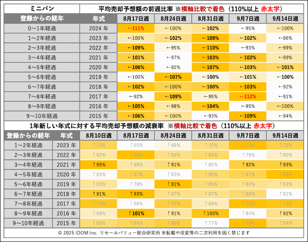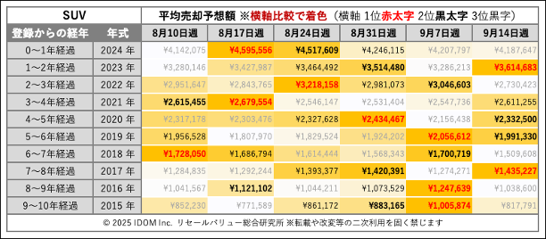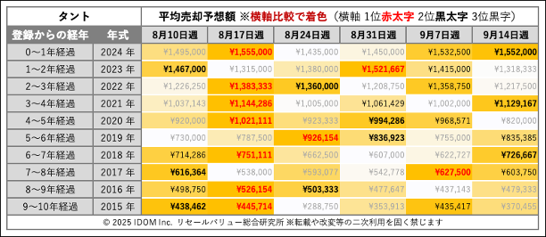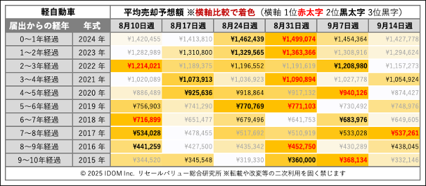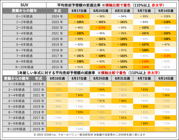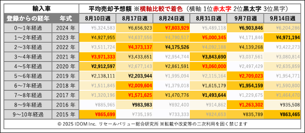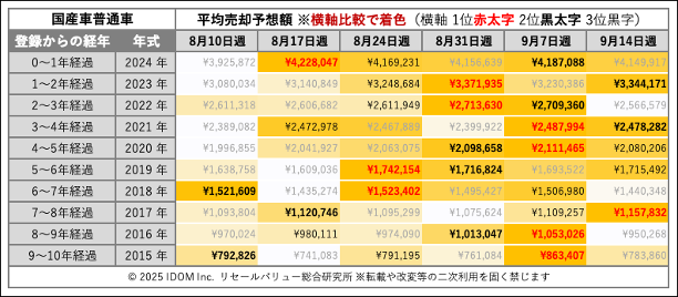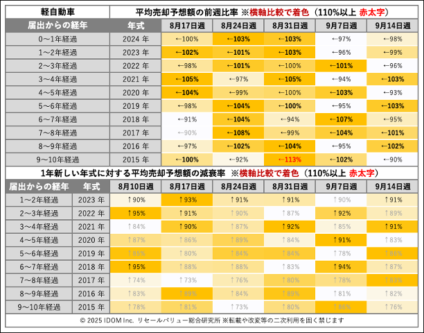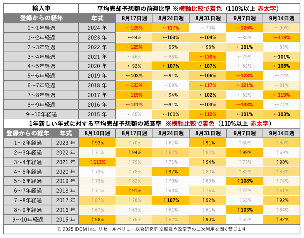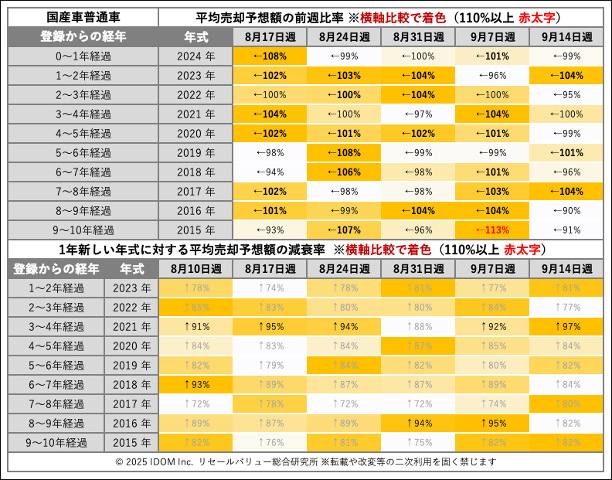 【週刊リセールバリュー】2025年第38週(9月14日週)の中古車買取相場/査定件数と売却予想額の推移