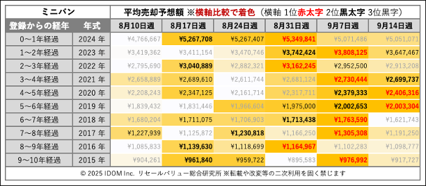 登録/届出から10年落ちまで(2015〜2024年式)の上位200車種を年式別に抽出し、前週との比較で平均売却予想額が上昇した順に並べています。