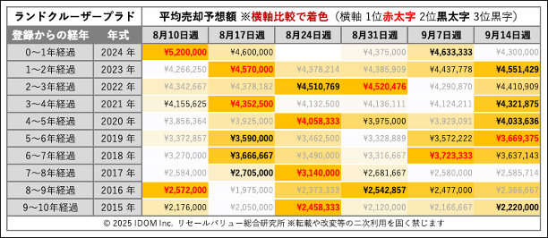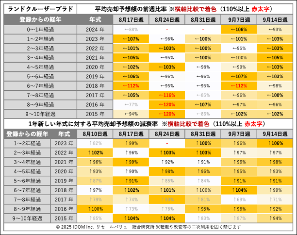 トヨタ ランドクルーザープラドの平均売却予想額が変化した割合