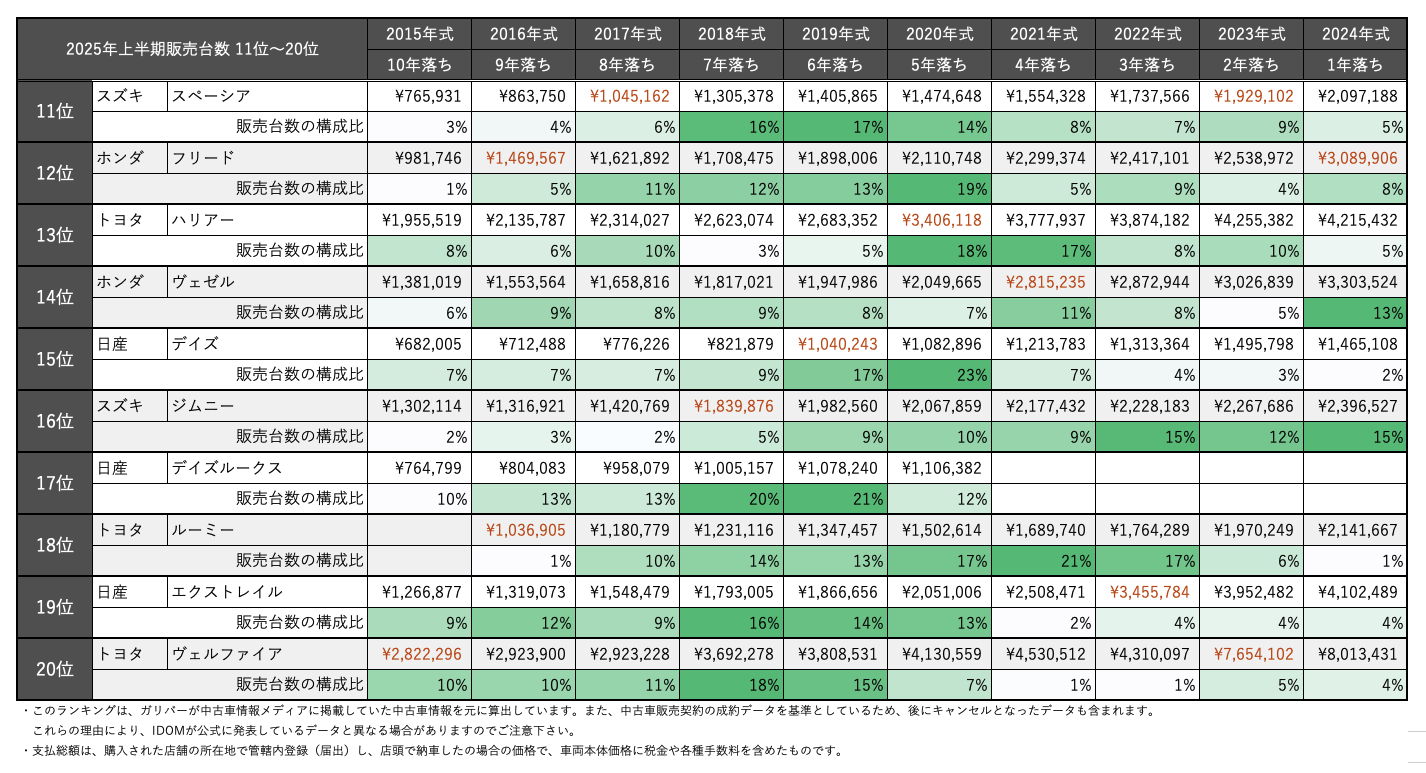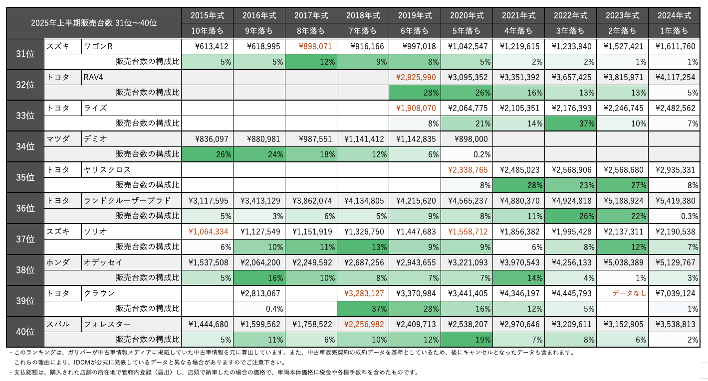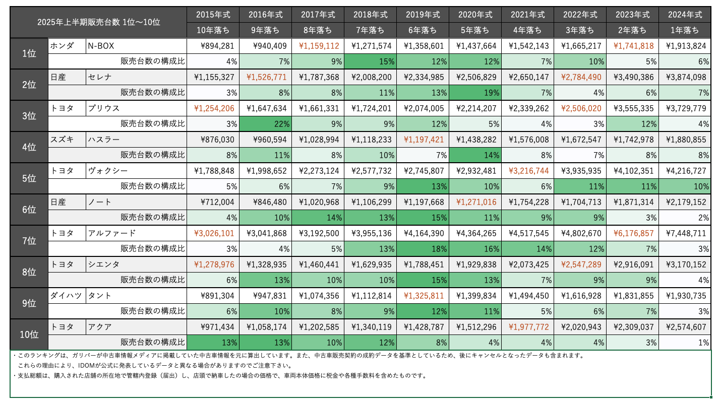 年式ごとの平均支払総額を一挙公開! 2025年上半期中古車販売台数ランキング〜気になる販売価格の相場は?あのクルマはいくらで買える?〜