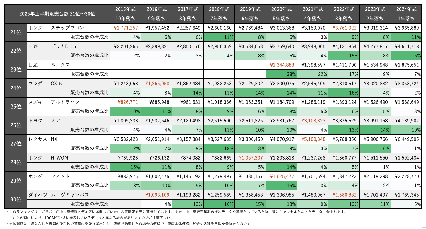 21位から30位までのランキングには、ミドルサイズミニバンの「ホンダ ステップワゴン」と「トヨタ ノア」がランクイン。トップ10にランクインした「日産 セレナ」と「トヨタ ヴォクシー」と大きく差が開きました。7年落ちの2018年式で支払総額を比較すると、ここでもやはりセレナのコスパの良さが光り、コスパを重視するファミリー層のニーズを吸収していることが示唆されます。一方で、ステップワゴンやノア、そして5位のヴォクシーは3年以内の高年式ゾーンでも販売台数が伸びている印象です。