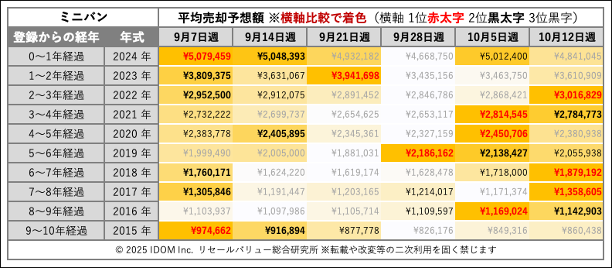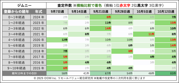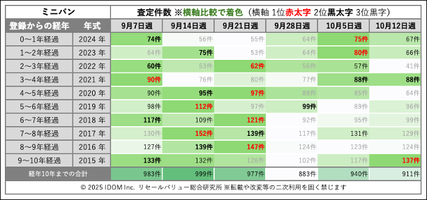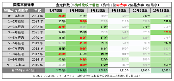 ガリバーの買取査定データをもとに、中古車売却の相場情報を週刊でお届けする。2025年第42週(10月12日週)は、査定件数(2015〜2024年式)の合計が前週の3,396件から3,565件へと増加。国産普通車、軽自動車、輸入車、SUVの各ジャンルが伸びているが、ミニバンのみは前週の940件から911件へと微減した。