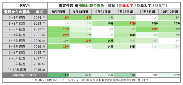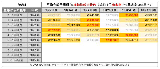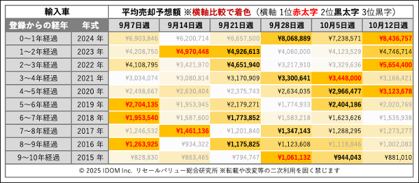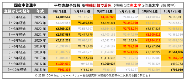 平均売却予想額の前週比率では、0〜1年経過車両が110%、8〜9年経過車両でも115%の上昇が見られるなど、幅広い年式でリセールバリューが堅調に推移しているのが特徴だ。