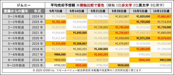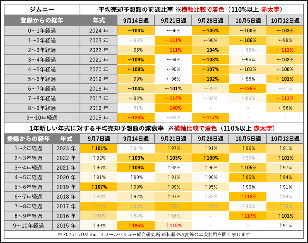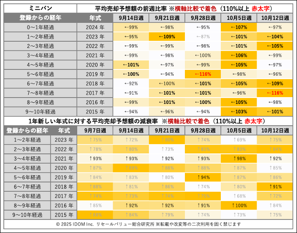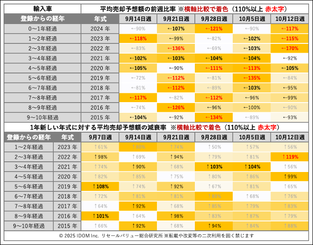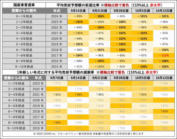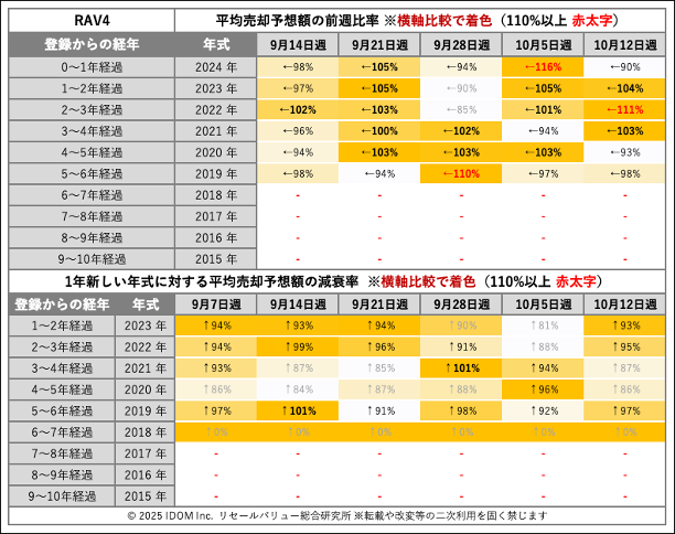 年式/車種/型式別で見る2025年第42週(10月12日週)と前週で比較した平均売却予想額の変化