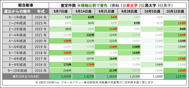 この週の特徴的な有意差は、2〜3年経過の車両で平均売却予想額が前週比170%という高騰を記録したことである。さらに、0〜1年経過車両においても117%の上昇が見られ、高年式を中心に市場価値が急激に上昇していることが明らかである。