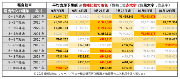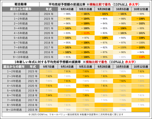 また、9〜10年経過車両では110%の上昇が見られ、古い年式の軽自動車がリセール市場で底堅い評価を維持している。