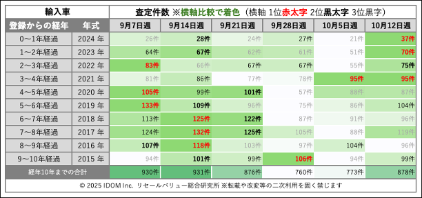 輸入車の査定件数(2015〜2024年式)は878件と前週から増加している。
