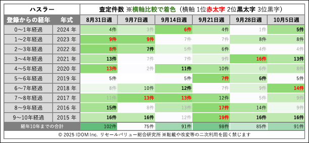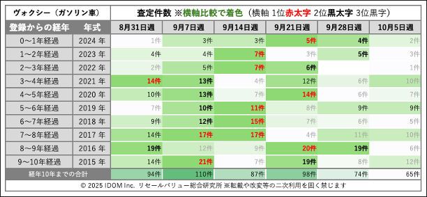 特徴的な有意差としては、2017年式(7〜8年落ち)の平均売却予想額が前週比約96.7%とわずかに下落しており、一部の年式で価格調整の動きが見られるものの、全体としては堅調な推移であると考えられる。