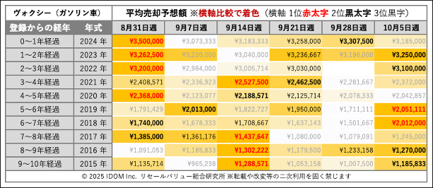 平均売却予想額のトレンドでは、2024年式(0〜1年落ち) が前週比で約107%の上昇を記録しており、新しいミニバンモデルに対する高い需要がリセールバリューを押し上げていると考えられる。