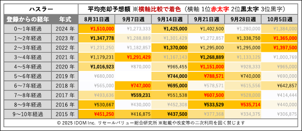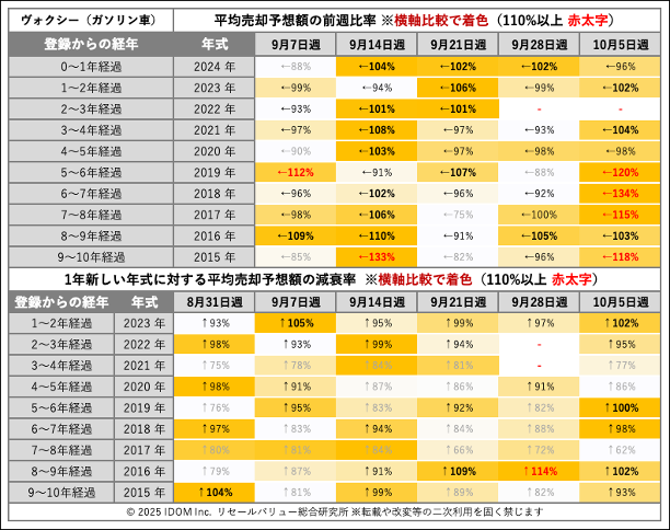 平均売却予想額のトレンドを見ると、2023年式(1〜2年落ち)が前週比約98.3%、2015年式(9〜10年落ち)が前週比約98.9%といずれも微減傾向にある。