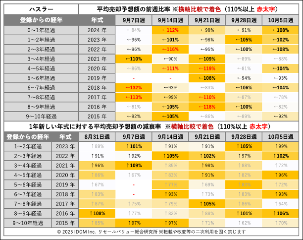 このジャンルで最も特徴的なのは、若年式中古車における価格の大幅な変動である。特に2024年式(0〜1年落ち) の平均売却予想額は、前週比で約90%と大きく下落しており、明確な有意差として認められる。