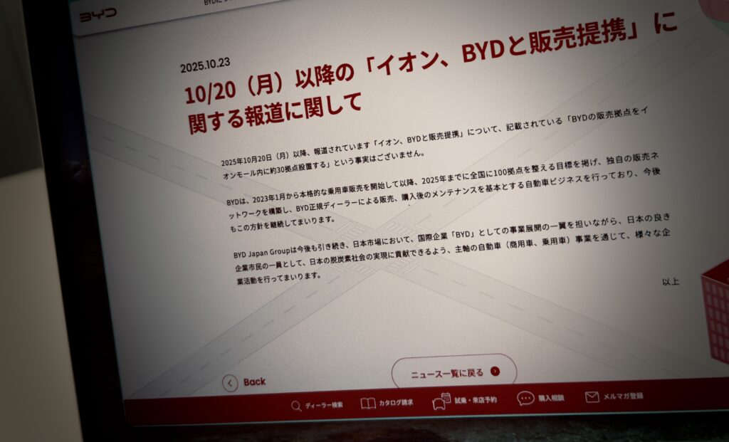 BYD Japanは10月23日、『10/20(月)以降の「イオン、BYDと販売提携」に関する報道に関して』という声明を公式ウェブサイトに掲載し、10月20日から各社が報じていたBYDとイオンの販売提携に関する報道の内容を否定しました。