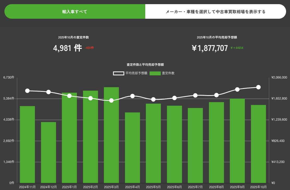 突発的に希少なクルマの査定が入ると輸入車全体の平均売却予想額がどんと上がってしまうので、なかなか傾向が掴みにくい。中古車買取の査定件数の波も国産車と異なります。
