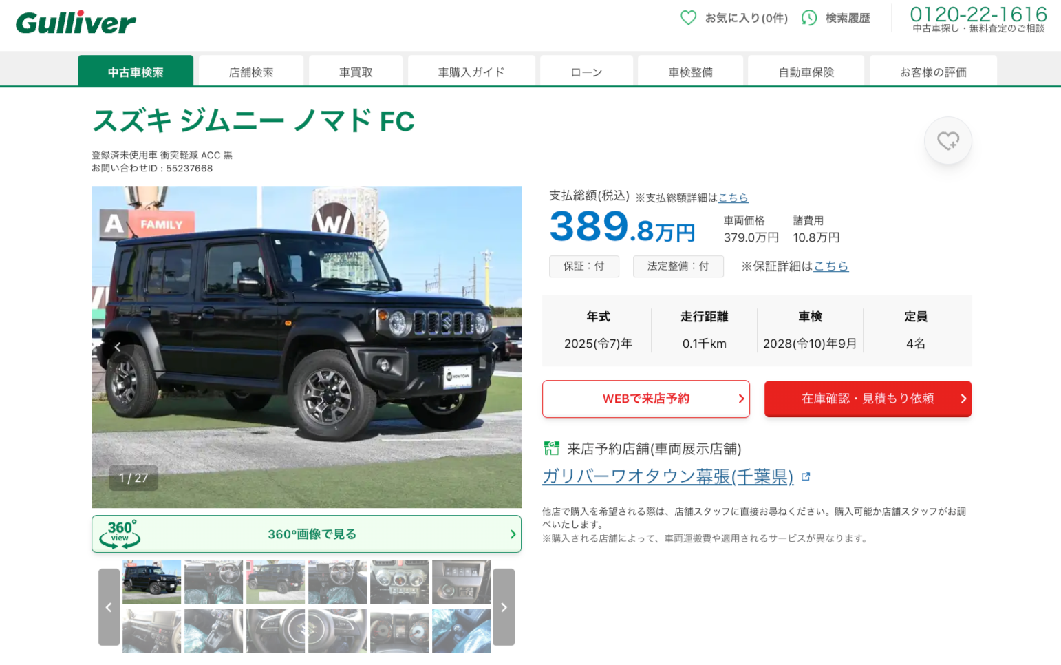 ガリバーのウェブサイトで、ジムニーノマドの中古車を検索してみたところ、10月27日現在の在庫は全国に49台。すべての在庫が走行距離1000km以下で、状態の非常に良い中古車が流通しています。しかし、その支払総額については、最安値で379万円から最高値で424万円と非常に高額で、在庫を仕入れる中古車オークションなどでも新車価格を大きく上回る高値で取引されていることを示唆しています。