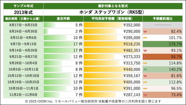 ホンダ ステップワゴン RK5型で査定件数最多の2013年式買取相場:過去12週間の推移