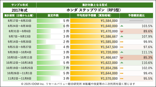 ホンダ ステップワゴン PR3型で査定件数最多の2017年式買取相場:過去12週間の推移