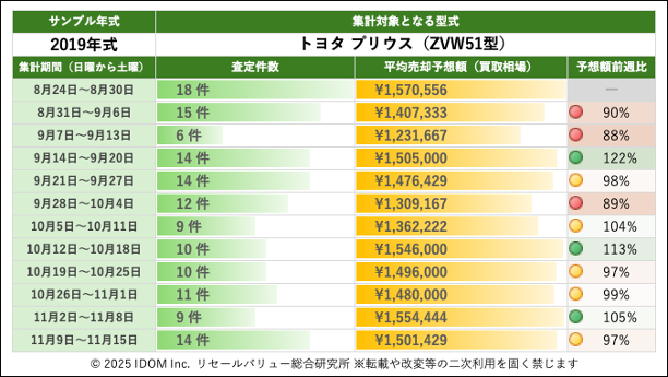 トヨタ プリウス ZVW51型で査定件数最多の2019年式買取相場:過去12週間の推移