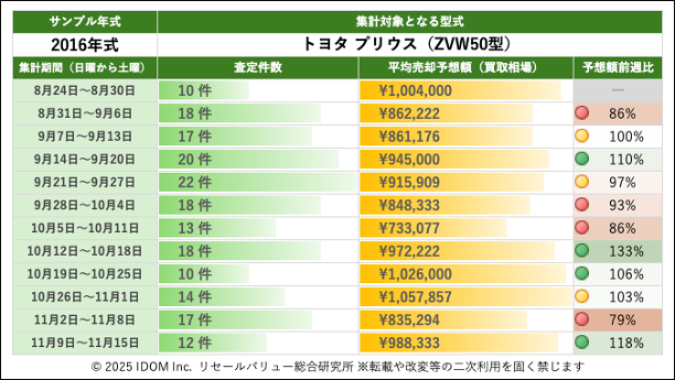 トヨタ プリウス ZVW50型で査定件数最多の2016年式買取相場:過去12週間の推移