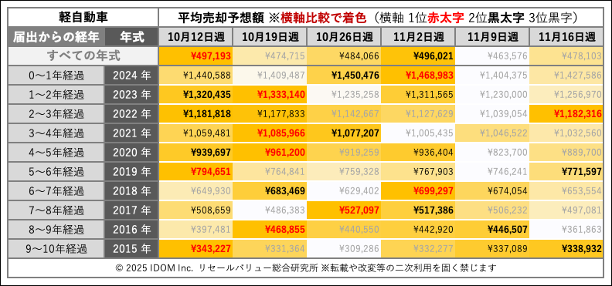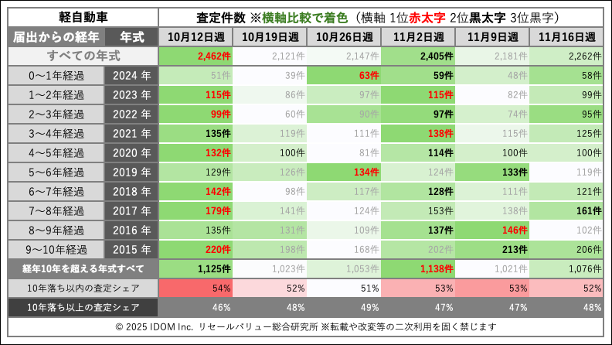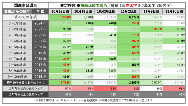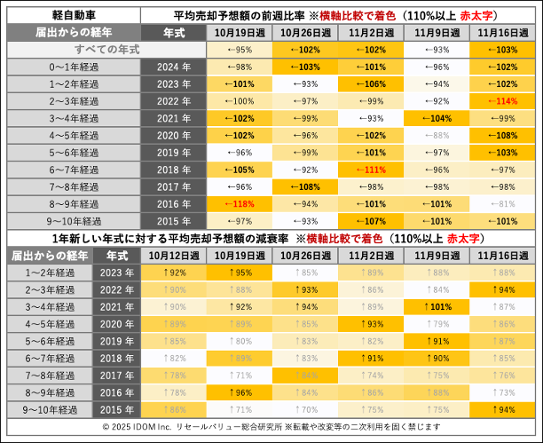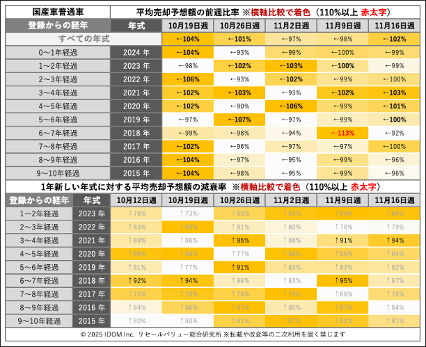 一方で低年式中古車、特に2015年式(9〜10年経過)は前週比96%と相場の下落が続いており、高年式と低年式の間で相場の動きに違いが見られる状況である。
