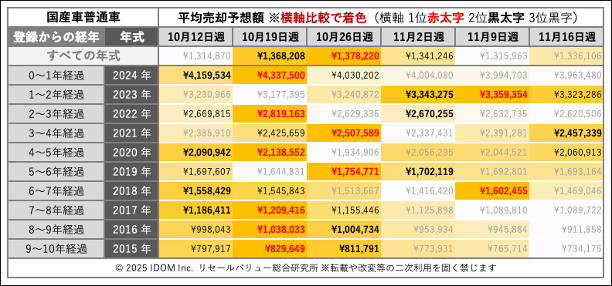 【週刊リセールバリュー】2025年第47週(11月16日週)の中古車買取相場/査定件数と売却予想額の推移