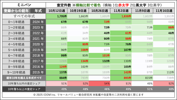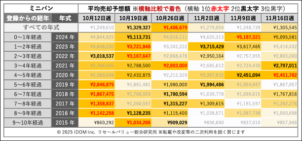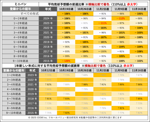 ミニバンの相場は高年式から低年式まで比較的堅調に推移しており、特に低年式である2017年式(7〜8年経過)が前週比108%と大きな上昇を記録している。