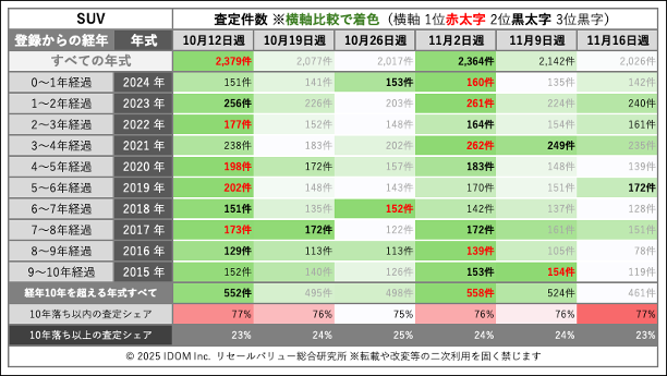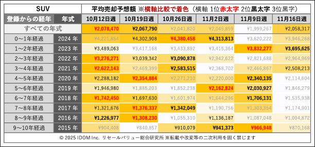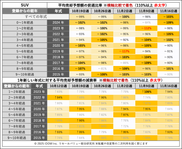 SUVの買取相場は、高年式の2024年式(0〜1年経過)は前週比109%と大きく相場が回復し、2022年式(2〜3年経過)も前週比105%と上昇している。しかし、中堅年式や低年式の中古車、特に2020年式(4〜5年経過)や2018年式(6〜7年経過)、2017年式(7〜8年経過)、2015年式(9〜10年経過)は、いずれも前週比90%または91%と相場が下落する傾向にある。