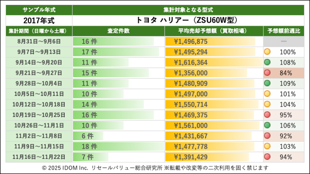 トヨタ ハリアー ZSU60W型で査定件数最多の2017年式買取相場:過去12週間の推移