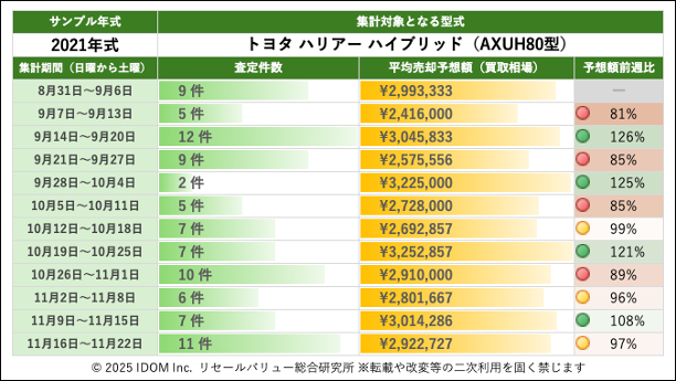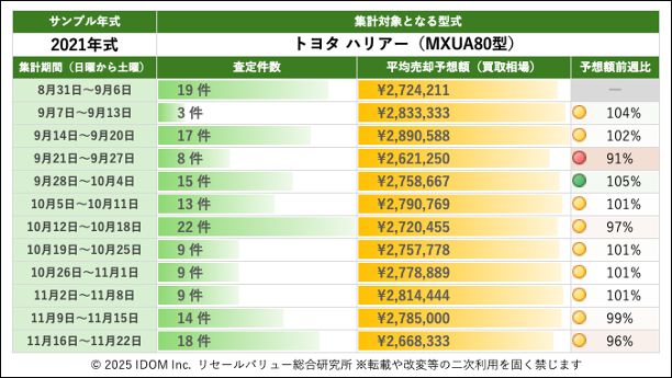トヨタ ハリアー MXUA80型で査定件数最多の2021年式買取相場:過去12週間の推移