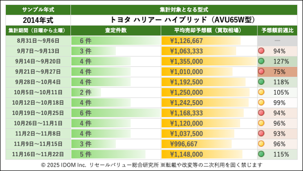 トヨタ ハリアー ハイブリッド AVU65W型で査定件数最多の2014年式買取相場:過去12週間の推移