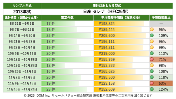 日産 セレナ HFC26型で査定件数最多の2013年式買取相場:過去12週間の推移