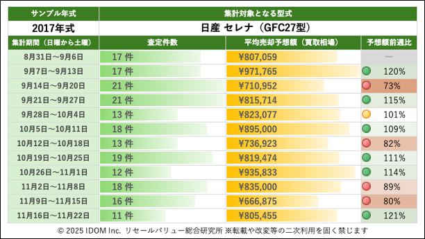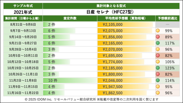| 集計期間(日曜から土曜) | 査定件数 | 平均売却予想額(買取相場) | 予想額前週比 |