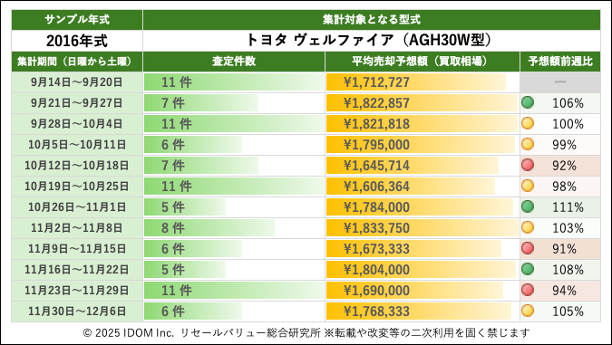 トヨタ ヴェルファイア AGH30W型で査定件数最多の2016年式買取相場:過去12週間の推移
