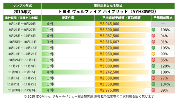 トヨタ ヴェルファイア AYH30W型で査定件数最多の2019年式買取相場:過去12週間の推移