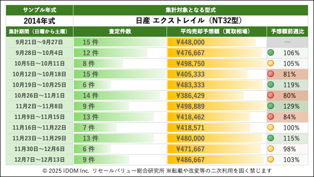 日産 エクストレイル NT32型で査定件数最多の2014年式買取相場:過去12週間の推移