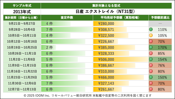 | 集計期間(日曜から土曜) | 査定件数 | 平均売却予想額(買取相場) | 予想額前週比 |