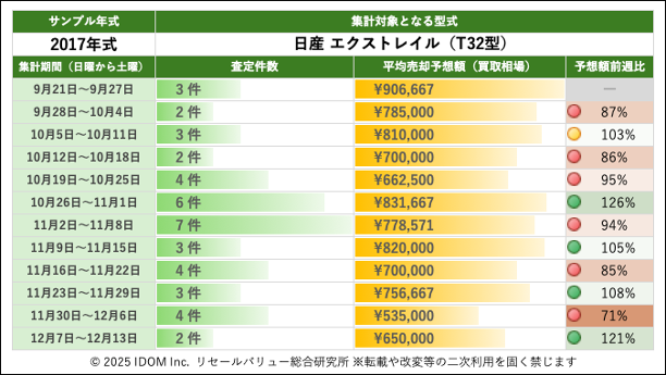 日産 エクストレイル T32型で査定件数最多の2017年式買取相場:過去12週間の推移