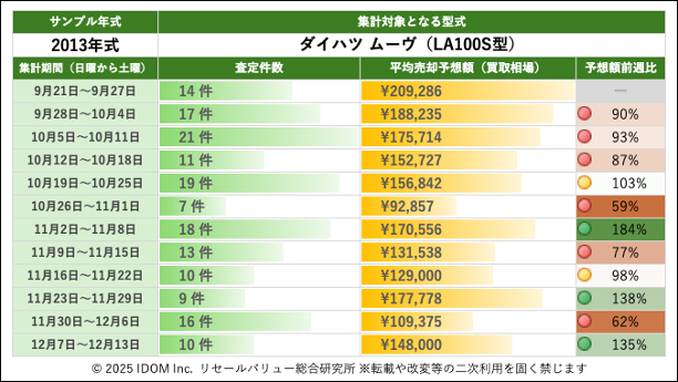 ダイハツ ムーヴ LA100S型で査定件数最多の2013年式買取相場:過去12週間の推移