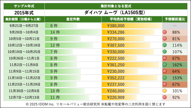 ダイハツ ムーヴ LA150S型で査定件数最多の2015年式買取相場:過去12週間の推移