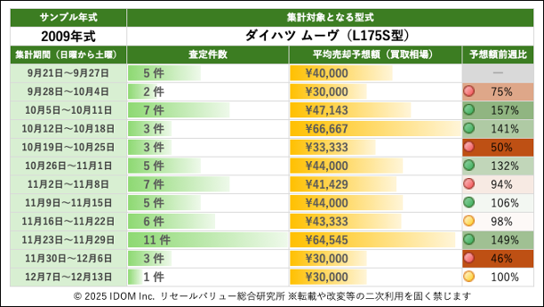 ダイハツ ムーヴ L175S型で査定件数最多の2009年式買取相場:過去12週間の推移