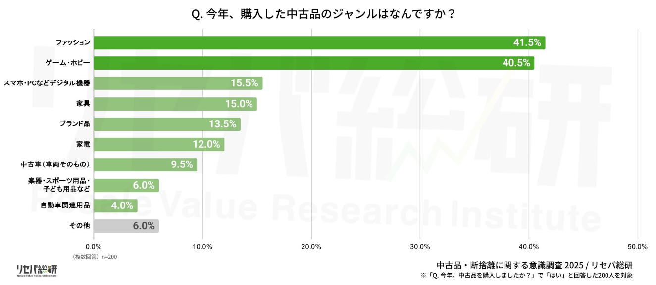 調査では、まず中古品の購入実態や購入意向について調べています。回答者のうち、今年中古品を購入した人に行った「今年、購入した中古品のジャンルは?」という質問(複数回答)に対しては、「ファッション」が41.5%と最も多く、続いて「ゲーム・ホビー」が40.5%という結果になりました。実用品よりも、趣味性の高いカテゴリーが上位を占めた点が特徴的で、中古ならではの“試しやすさ”や“始めやすさ”が購買を後押ししているようです。全体として、中古品が節約目的だけではなく、興味や楽しみを広げる手段として活用されつつある様子がうかがえます。