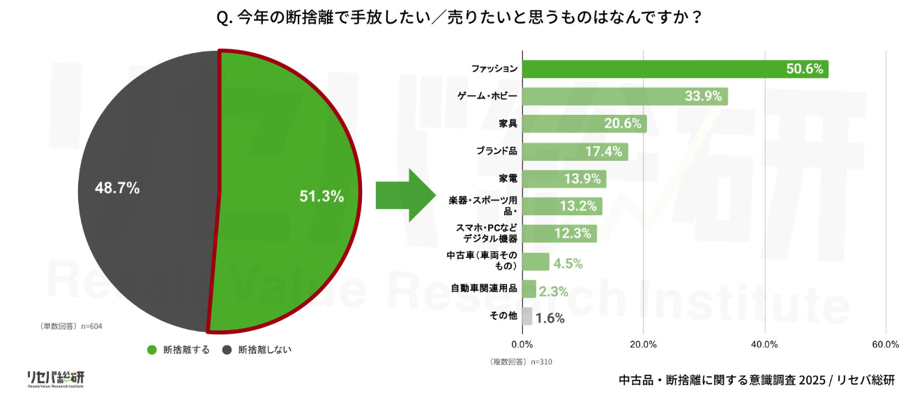 ちなみに、「断捨離する」と回答した人に聞いた「今年の断捨離で手放したい/売りたいと思うものは?」という質問(複数回答)に対しては、「ファッション(衣類・靴・小物)」が50.6%と最も多く、次いで「ゲーム・ホビー」が33.9%、「家具」が20.6%、「ブランド品」が17.4%という結果になりました。衣類を中心に「場所を取るもの」「使わなくなりやすいもの」が上位を占め、身の回りのスペースを見直す“負担の少ない断捨離”が中心になっていることが伺えます。