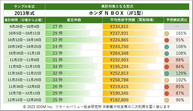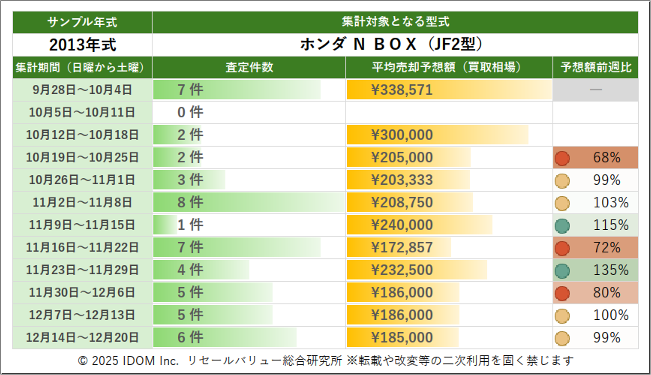 ホンダ N-BOX JF2型で査定件数最多の2013年式買取相場:過去12週間の推移