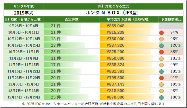 ホンダ N-BOX JF3型で査定件数最多の2019年式買取相場:過去12週間の推移