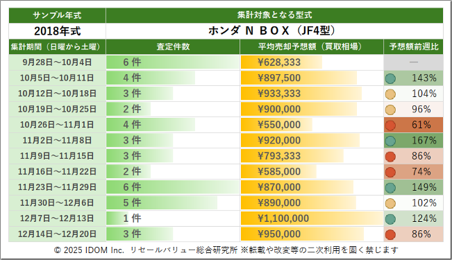 ホンダ N-BOX JF4型で査定件数最多の2018年式買取相場:過去12週間の推移