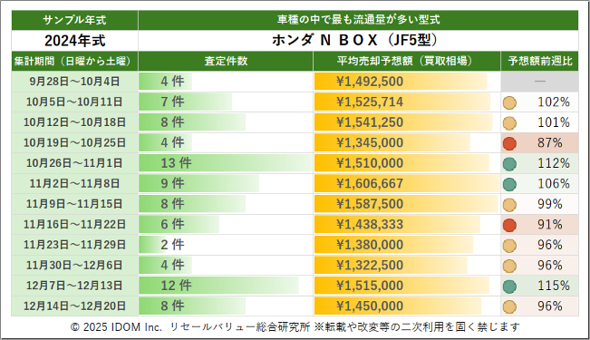 ホンダ N-BOX JF5型で査定件数最多の2024年式買取相場:過去12週間の推移