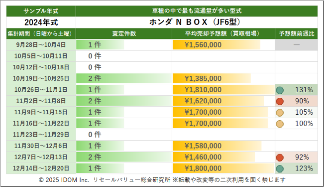 ホンダ N-BOX JF6型で査定件数最多の2024年式買取相場:過去12週間の推移